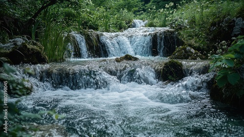Fototapeta premium Lush forest waterfall cascading over rocks, nature background, tranquility scene
