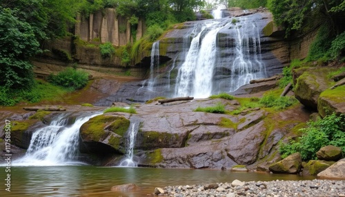 © awan toklo, Obraz premium Lush Forest Waterfall Cascading Rocks, Nature Scene