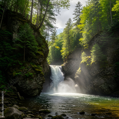 © Mdndm, Obraz premium Lush Forest Waterfall Scene