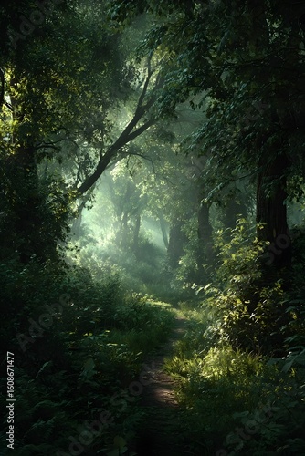 © YiXiong, Fototapeta premium Lush forest with dappled sunlight on a clear day.