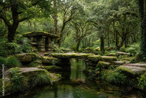 Naklejka premium Lush forest with stone bridge over tranquil stream