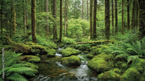 Obraz premium Lush forest with stream and ferns