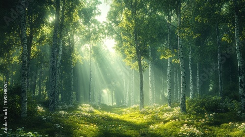 © julio, Fototapeta premium Lush forest with sunlight filtering through trees and flowers.