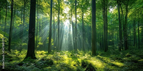 Fototapeta premium Lush forest with sunlight filtering through trees, creating a serene atmosphere.