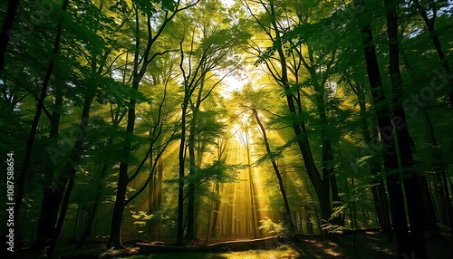 Fototapeta premium Lush forest with vibrant green trees, sunlight streaming through the canopy,...