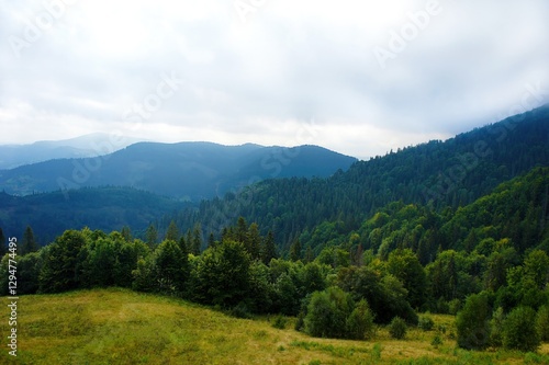 © Viktoria Tom, Fototapeta premium Lush forested mountains under a cloudy sky with rolling hills and vast greenery