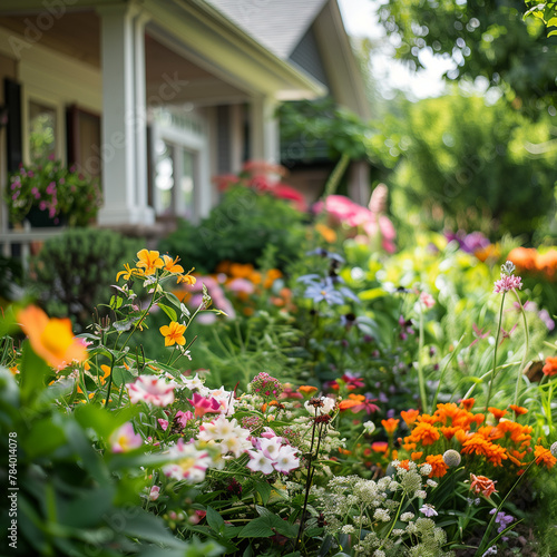 Fototapeta premium Lush Garden Bed in Full Bloom Against Picturesque Suburban Home, AI Generation