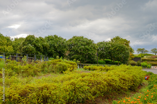 © Kazutaka, Fototapeta premium Lush Garden Landscape with Blooming Trees Under Cloudy Sky