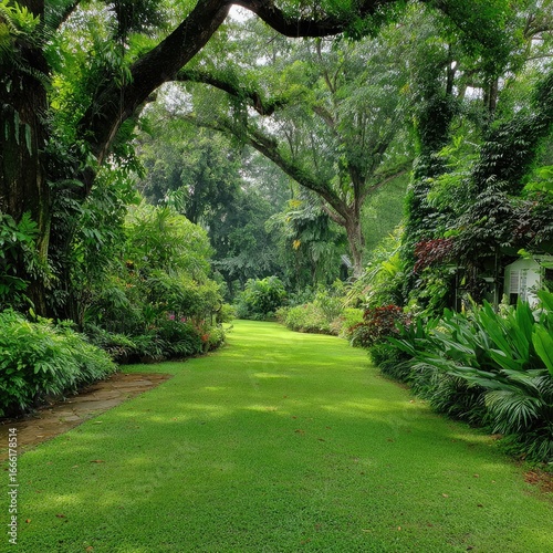 © ummu, Obraz premium Lush garden path, shaded by trees