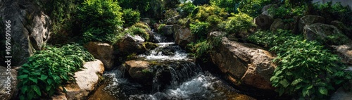 © Wenda, Naklejka premium Lush garden with a small waterfall cascading over rocks