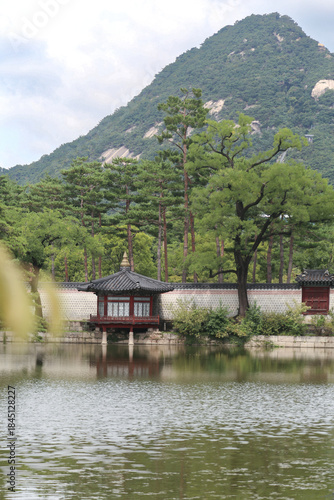 Fototapeta premium Lush garden with pond, at Hyeonbokgung Palace
