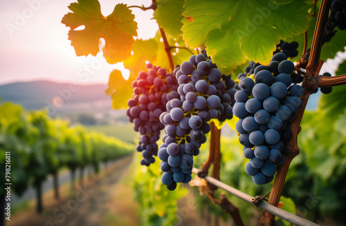 Fototapeta premium Lush grape clusters hanging from vines in a vineyard. Sunlit agricultural...