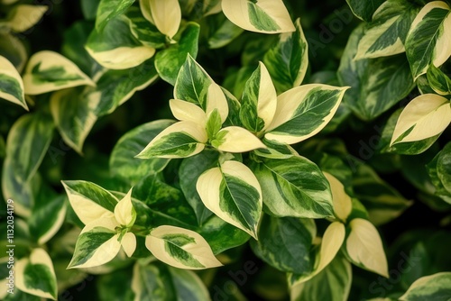 © Art Jabz, Obraz premium Lush green and cream variegated leaves close-up.