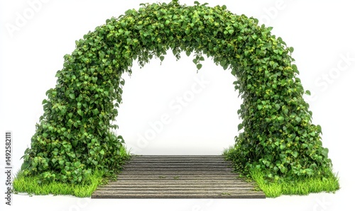 Fototapeta premium Lush green archway entrance, wooden path, garden backdrop; wedding, event decor