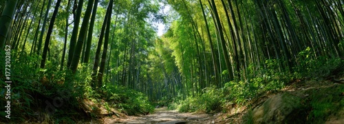 © mryanfahrudin1, Obraz premium Lush green bamboo forest pathway