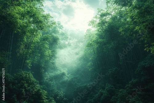 © Tanu, Fototapeta premium Lush green bamboo forest with mist and sunlight filtering through the trees in a serene natural setting