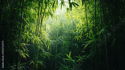 Naklejka premium Lush Green Bamboo Forest with Sunlight Filtering Through Leaves and Creating...