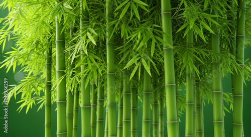 Fototapeta premium Lush Green Bamboo Forest with Tall Stalks and Fresh Leaves against Green Background