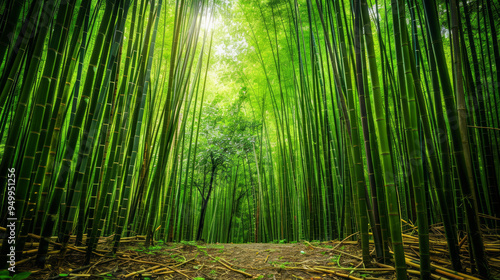 © Jafree, Fototapeta premium Lush Green Bamboo Grove with Tall Stalks Reaching Skyward in a Dense Forest. Concept of Nature, Serenity, Growth, and Environmental Beauty