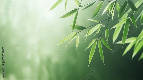 © BerkahStock, Naklejka premium Lush green bamboo leaves against a soft blurred background, evoking tranquility and nature.