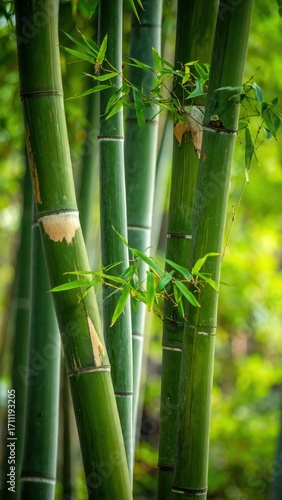 © Kitta Studio, Obraz premium Lush Green Bamboo Stems with Vivid Green Leaves in Nature Setting