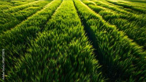 © filmanana, Fototapeta premium Lush green barley field at sunrise capturing nature's tranquility. Long grass landscape