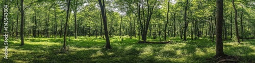 Fototapeta premium Lush Green Birch Forest: A Panoramic Summer Landscape with Majestic White Trees