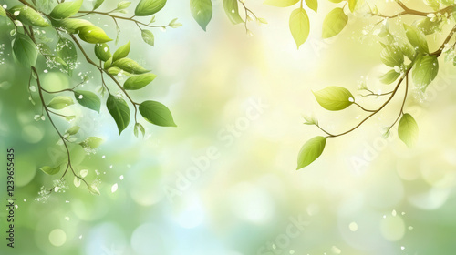 © Jafree, Fototapeta premium Lush Green Branches and Soft Blossoms Against Sunlit Background. Concept of Spring Renewal, Nature's Beauty, Tranquil Environment, Fresh Beginnings. Copy space. Spring background