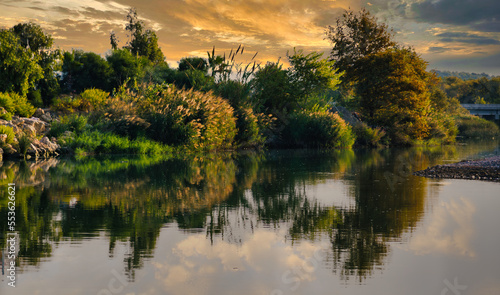 © tanacha, Obraz premium lush green bushes and trees grow along the river and are reflected in the calm water at sunset in turkey