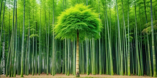 © PloyJai, Fototapeta premium Lush Green Canopy of a Single Tree Rising Amidst a Dense Bamboo Forest