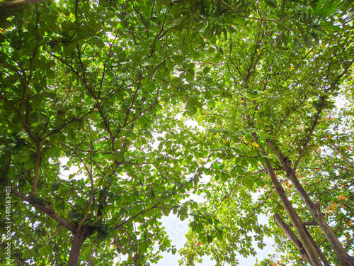 Obraz premium Lush green canopy of trees reaching for the sky.