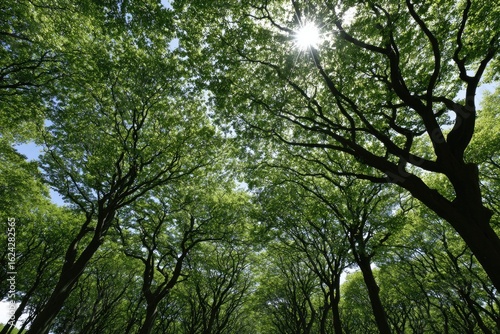 © In, Obraz premium Lush green canopy of trees reaching towards sunlit sky