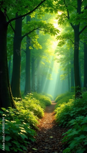 © Montip, Obraz premium Lush green canopy, sunlight dappling forest floor, jade, growth