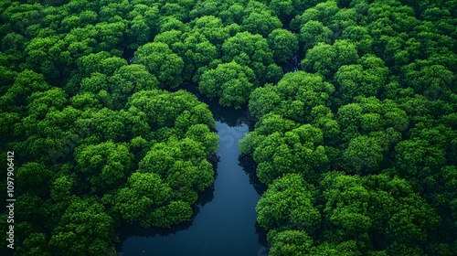 Naklejka premium Lush green canopy with a winding river amidst dense forest.