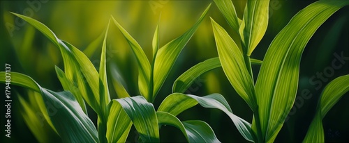 © ckybe, Fototapeta premium Lush green corn leaves soaking up warm golden light on a calm summer night