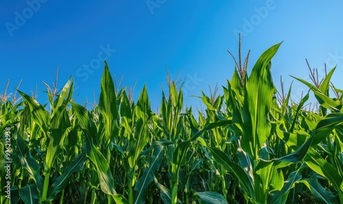 Fototapeta premium Lush green cornfield under a clear blue sky