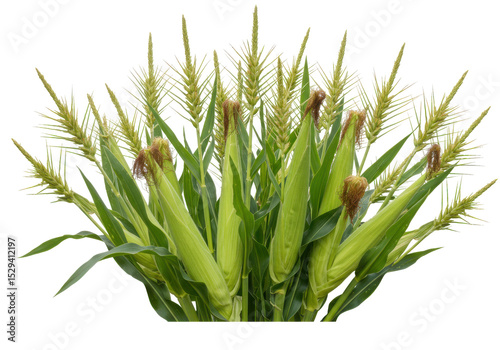 © Syafitri, Obraz premium Lush green cornfield with ripe ears of corn under a bright blue sky