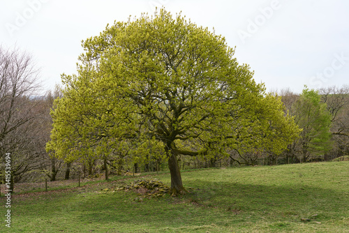 © Paul, Fototapeta premium Lush green English Oak tree standing alone in a sprawling grassy field.