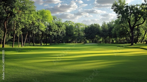 Fototapeta premium Lush green fairway on a golf course with surrounding trees on a sunny day