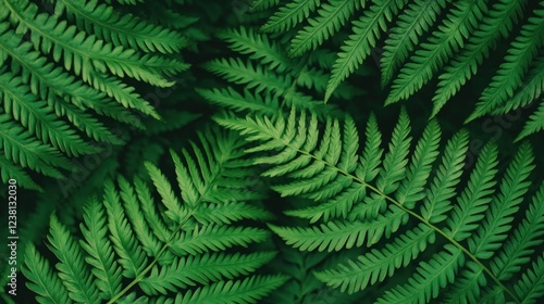 © Phanupong, Obraz premium Lush Green Fern Leaves with Intricate Patterns Set Against a Dark Background Ideal for Nature and Botanical Designs