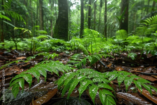 © NikahGeh, Obraz premium Lush Green Ferns on a Forest Floor with Sunlight Filtering Through the Canopy