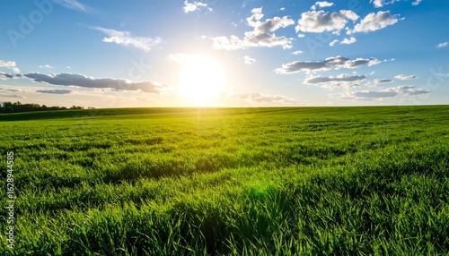 © Sintia, Fototapeta premium Lush green field at sunset