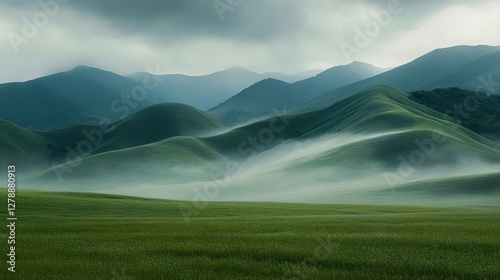© Diffin, Fototapeta premium Lush green field foreground with majestic mountains shrouded in mist, creating a serene and mystical landscape.