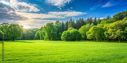 © Pluto, Obraz premium Lush Green Field Framed by a Canopy of Trees Under a Blue Sky with White Clouds