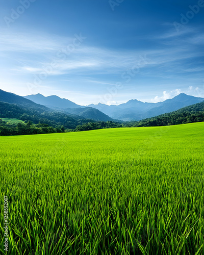 Fototapeta premium Lush green field stretches towards distant mountains under a bright blue sky, ideal for nature themes