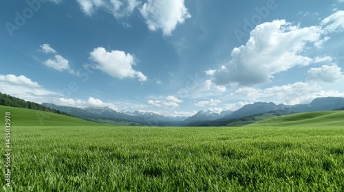 © tugkiara, Fototapeta premium Lush green field stretching to distant mountains under a partly cloudy sky