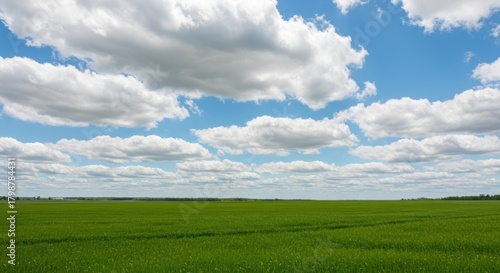 © logitech, Fototapeta premium Lush Green Field Under a Blue Sky with Puffy White Clouds.