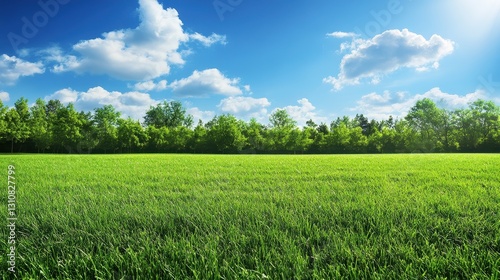 Obraz premium Lush green field under a vibrant blue sky, trees line the horizon. Perfect...