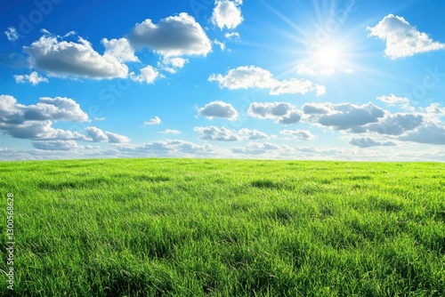 Fototapeta premium Lush Green Field Under Bright Blue Sky with Fluffy White Clouds