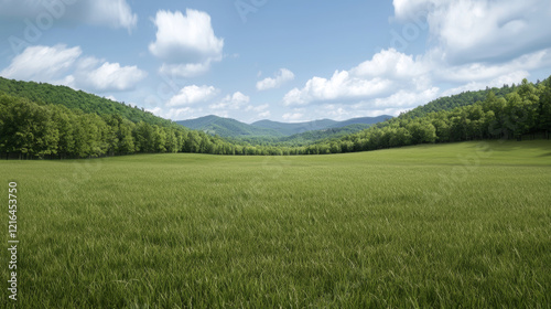 © chok, Fototapeta premium Lush green field with distant mountains under blue sky